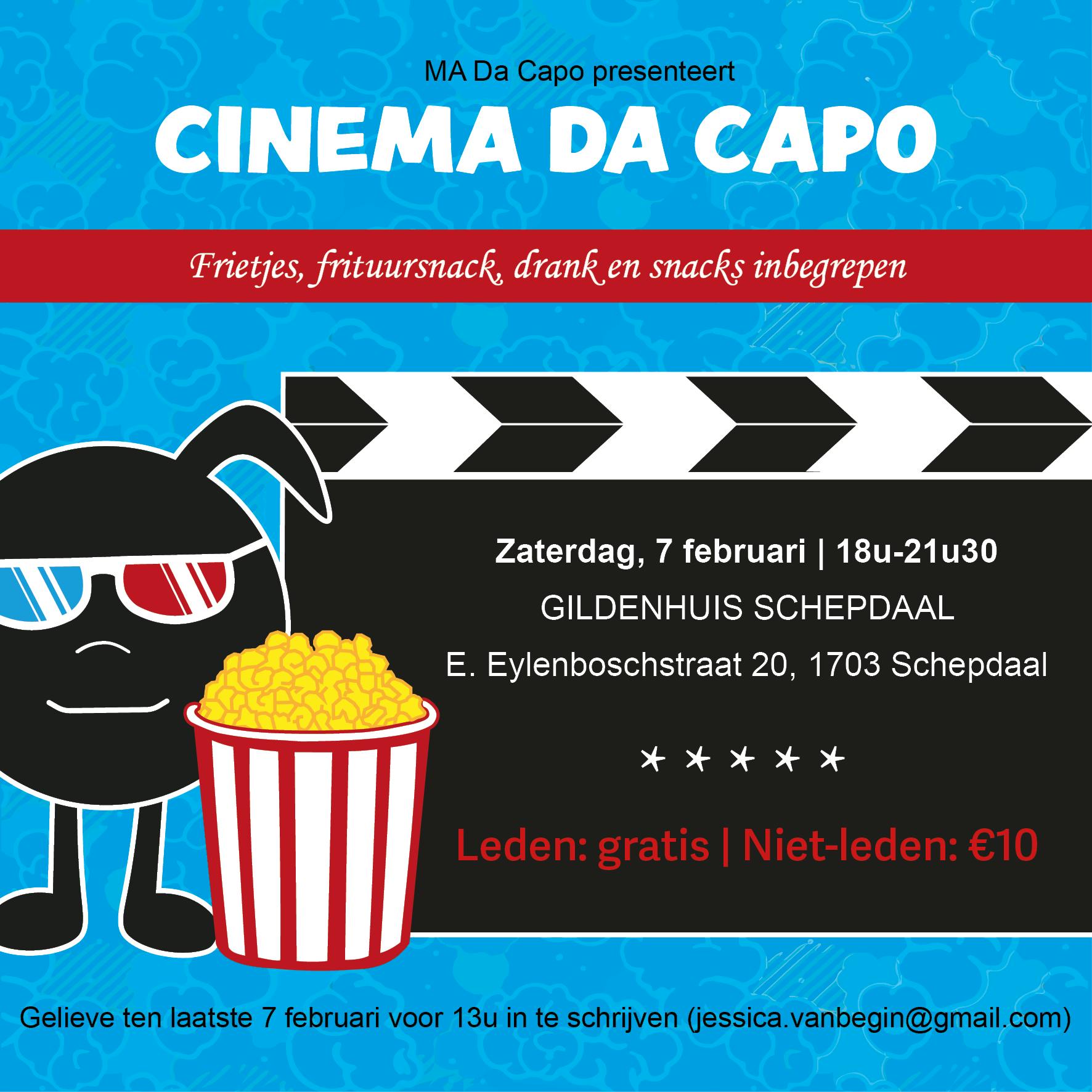 Op 7 februari organiseert het muziekatelier Da Capo een filmavond! Tussen de frietjes door leer je onze vereniging en leden kennen en kiezen we samen een leuke film, met snacks natuurlijk. Ben jij er ook bij?