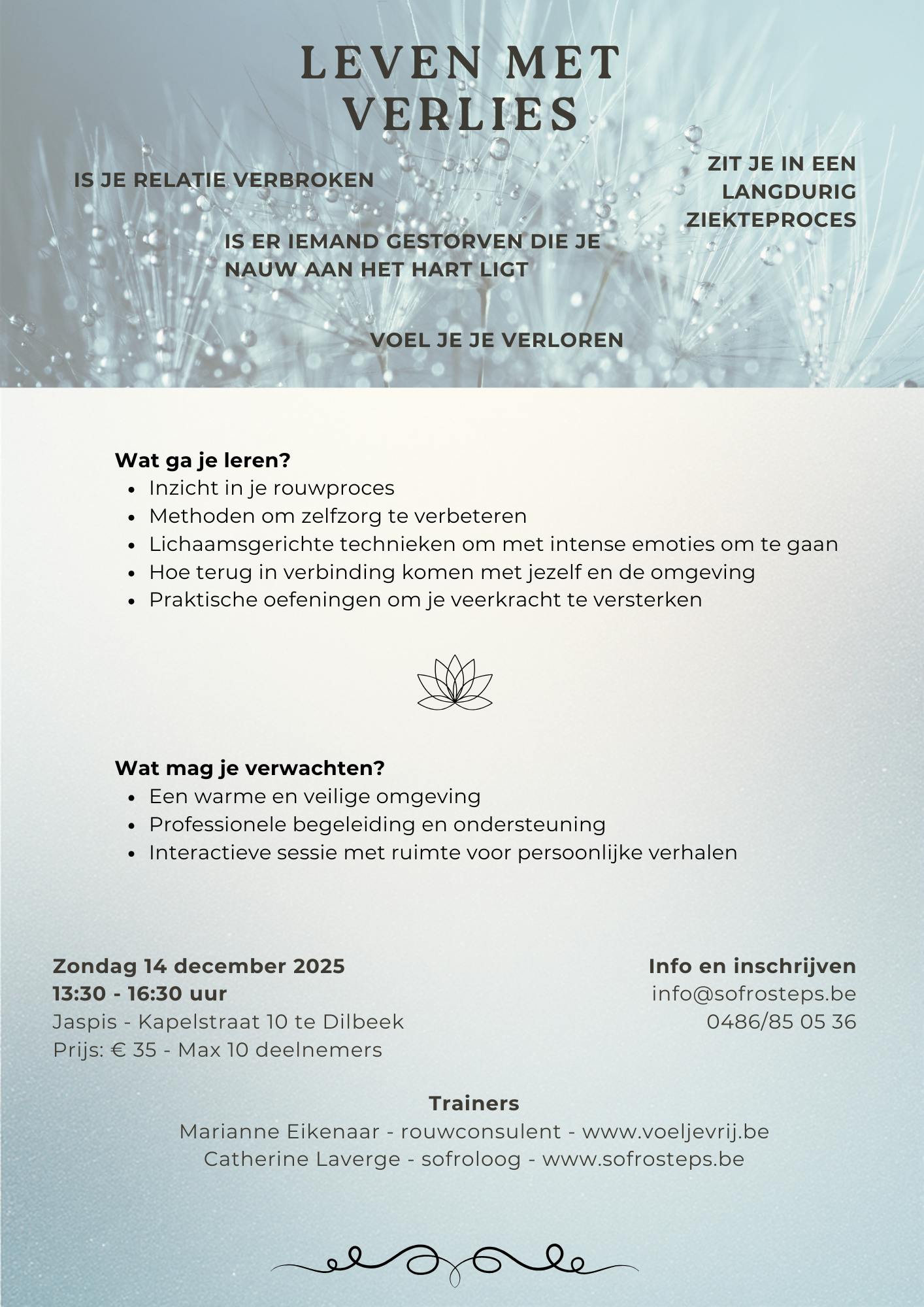 Op zondag 14/12/25 organiseren Marianne (Rouwconsulent) en Catherine (Sofroloog) een sessie rond LEVEN MET VERLIES in Dilbeek (Groepspraktijk Jaspis - Kapelstraat 10). Je krijgt inzicht in je rouwproces en leert lichaamsgerichte technieken om met intense emoties om te gaan. Wij bieden jou een warme en veilige plek waar je leert toelaten ipv loslaten.