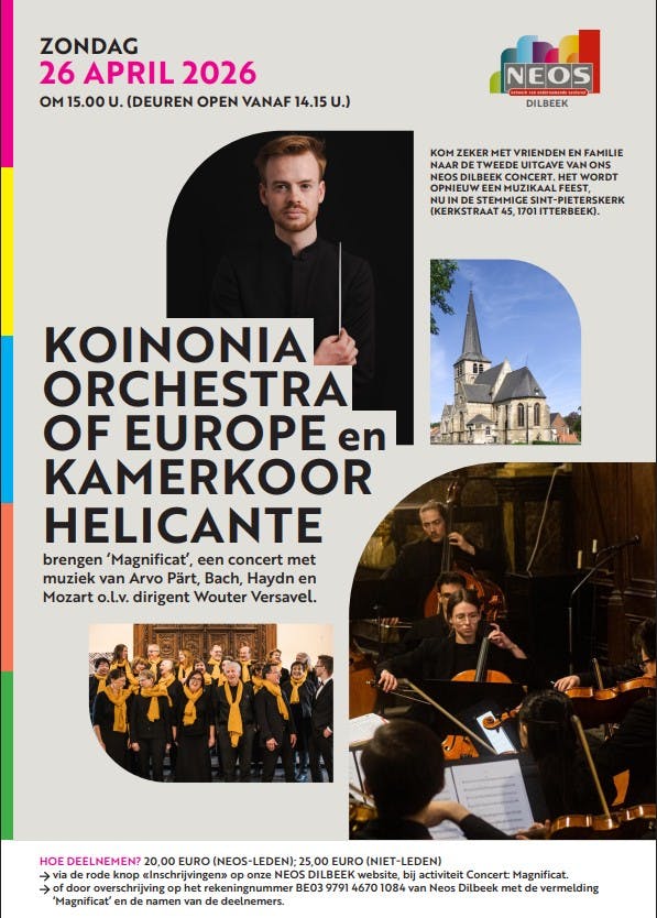 Of door storting van het bedrag op de rekening van Neos Dilbeek BE03 9791 4670 1084 met vermelding "Magnificat + naam van de deelnemers".